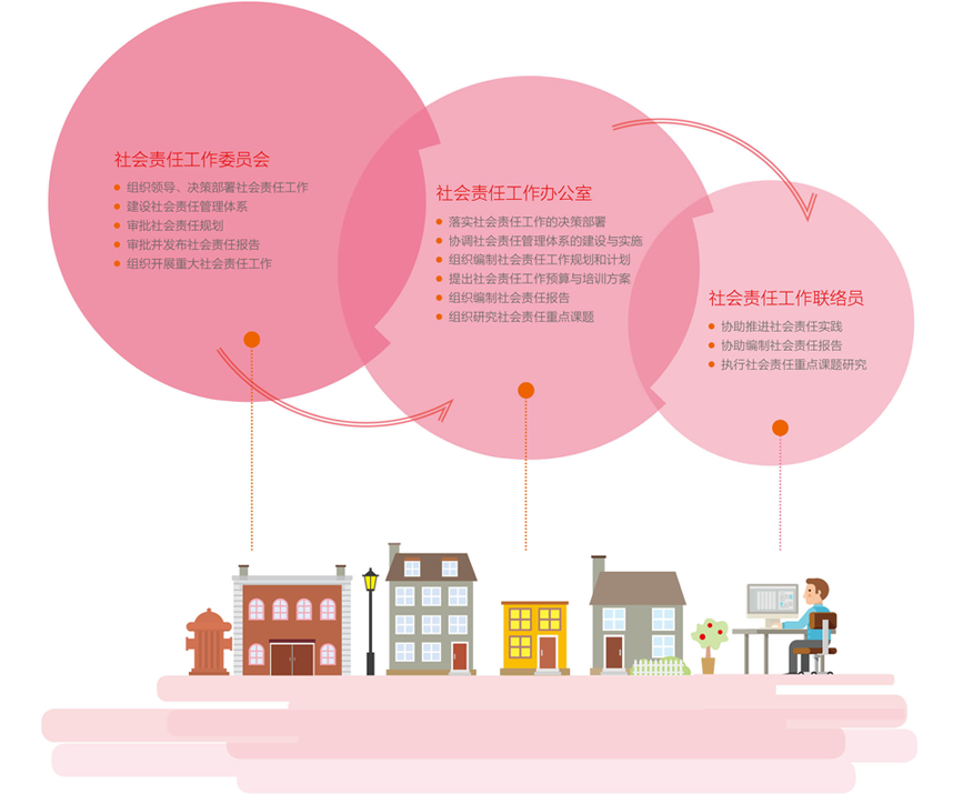 CMEC成立以董事長為主任、總裁為執行主任、各職能部門和事業部總經理為委員的社會責任工作委員會,負責統籌、規劃和協調公司全面社會責任工作;委員會下設社會責任工作辦公室,設在戰略與經營發展部,負責委員會的決策落實和日常工作;各職能部門和事業部建立社會責任工作聯絡員,負責實施和完成本部門或單位企業社會責任管理的相關工作。